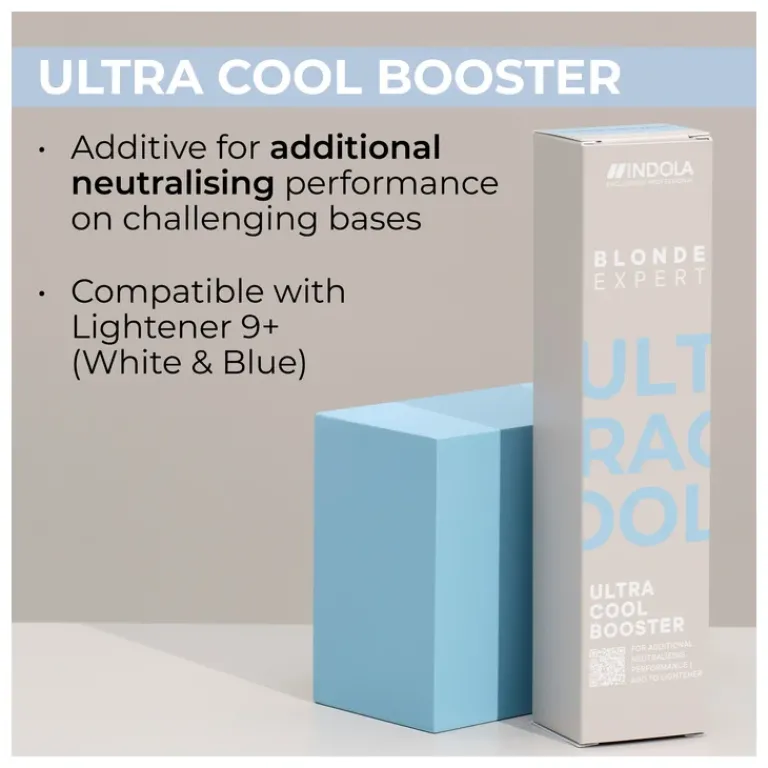 De Indola Blonde Expert Ultra Cool Booster is een toevoeging op het blondeerproces die helpt om ongewenste warme ondertonen te neutraliseren. Het product is ontwikkeld voor gebruik samen met de Blonde Expert Lightener 9+ (wit of blauw) en werkt zelfs op natuurlijke basiskleuren vanaf middenblond en donkerder. De vernieuwde formule bevat Hair-Bond Technology, die het haar tijdens het blonderen beschermt. Deze technologie legt een laagje rond de haarstructuur, waardoor breuk wordt verminderd en het haar sterk en veerkrachtig blijft.