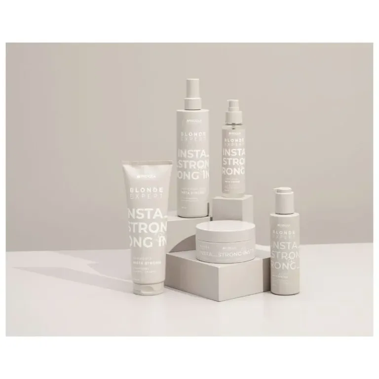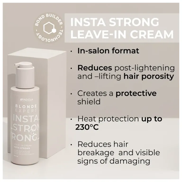 De Indola Blonde Expert InstaStrong Leave In Cream is een diepe verzorging voor blond haar na het oplichten of kleuren. Dit een van de nieuwe hero’s van de Blonde Expert lijn, Deze vegan leave-in crème met Bonding Technology, panthenol en zonnebloemzaadolie helpt het haar van binnenuit te herstellen en maakt het sterker en veerkrachtiger. De formule vermindert de porositeit van het haar na een blondeerservice en laat het haar glad, glanzend en verzorgd achter. Dankzij de toegevoegde hittebescherming tot 230°C is de crème ook perfect om het haar voor te bereiden op styling met föhn of stijltang.